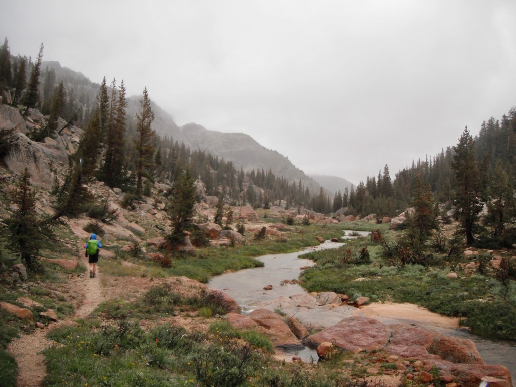 By mile 16 we were freezing, had no sensation in our fingers, it had begun to hail, and moral was low. The trail through the meadow was flooded from 3 days of rain and we were sloshing through calf high water, so we switched on turbo hiking mode and walked as fast as we could. Eventually the wintery mix subsided a bit and we spotted a place to camp and took that opportunity like our life depended on it. Nothing motivates backpackers quite like trying to get a tent set up in a gap in a storm.