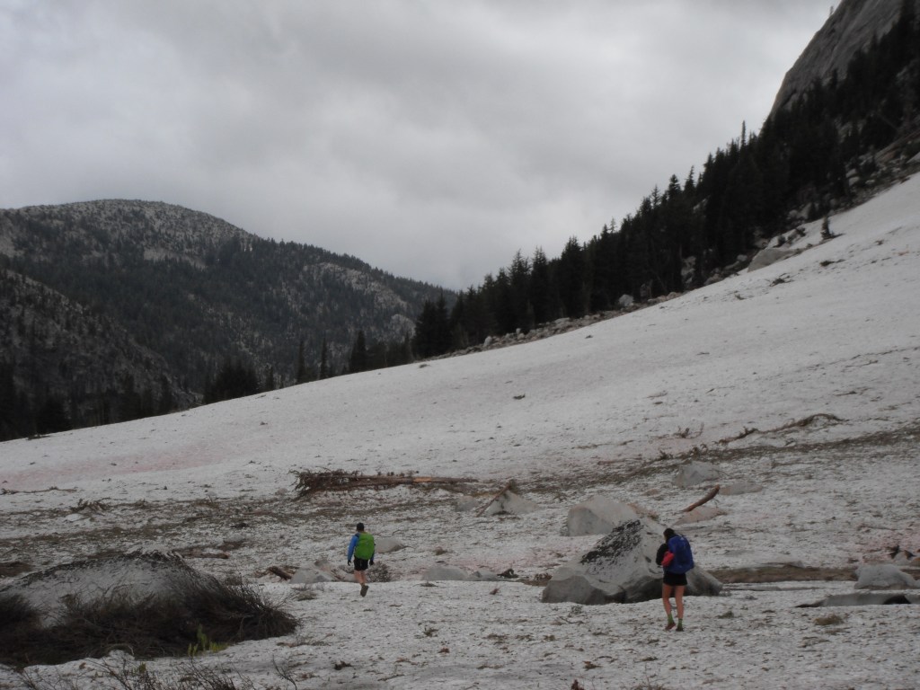 On Saturday, we woke up to chilly temperatures and intermittent rain. We had two passes on the docket today, Mule Pass, then Burro Pass. Worried about possible thunderstorms, we were motivated to get moving and minimize time above tree line. Even in September, the record snow pack was still covering the trail on the majority of Mule Pass. The trail switch backs up a boulder field that was easy enough to navigate between the patches of snow. We did have to do a few snow crossings, but the snow was still firm and stable. As soon as we reached the top of the pass, the sky opened up and it started pouring (above left). The top of Mule pass is the border between Hoover and Yosemite Wilderness, so we got our rain layers on and hiked down into Yosemite. Burro Pass was in similar condition: lots of snow covering the trail leading up to it and a brief little boot pack to get over the top. The moment we crested the pass, the wind coming up Matterhorn canyon smacked us right in the face and continued to howl until we got below tree line. This pass sits right below Matterhorn Peak, but because of the low hanging clouds we only got a few brief glimpses. Alas.