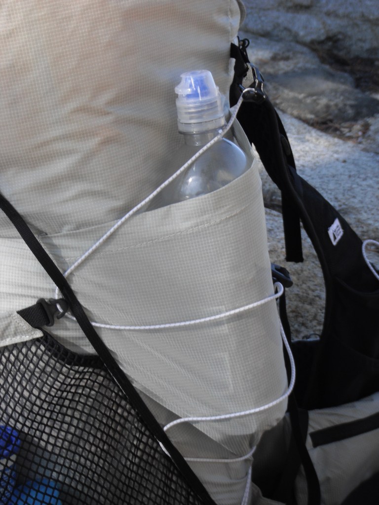 The side pockets are shaped like long narrow Vs, stretching almost the entire height of the frame, with the width at the top being barely large enough to cram in a bottle when fully packed. The odd shape makes me think they were designed to hold tent poles, not water bottles. Due to the height, anything in the pockets is not accessible without taking off the pack. The pockets are made of the same material as the body, a non-stretch fabric, and are not gusseted. With a full pack, it becomes extremely challenging to insert or remove water bottles, even with the pack off. The picture on the website shows a Nalgene in the pocket, but unless you want to fight for your life to get it back in, I highly recommend a narrower bottle– even getting a 1.2L smartwater bottle in and out was a struggle that got old quickly.