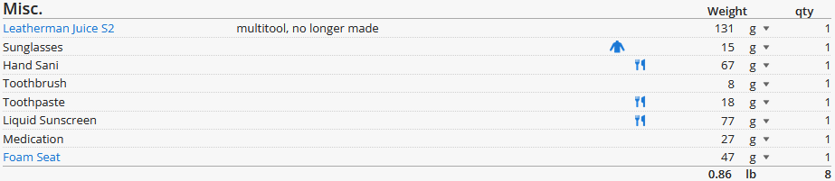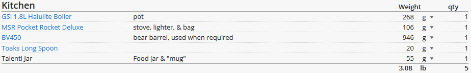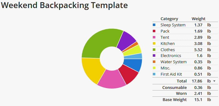 I’d consider my backpacking style “lightweight”, prioritizing gear I already own while slowly upgrading key items over time. If you’re a data nerd or an ultralight addict and haven’t heard of LighterPack, go check it out. We’ll be using an example Weekend Backpacking Template that I made, and break down each section. WordPress won’t let me embed the list, so we will be using screenshots instead.