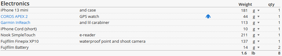 I track my hike on a Coros Apex 2 GPS watch, which has incredible battery life (lasted a 4 day, 50 mile backpacking trip on a single charge), so I keep my Garmin inReach is turned off unless I am sending a text message, which I do when I arrive at my camp spot for the night. Occasionally, I’ll bring my trusty old Nook SimpleTouch from 2011, if I think I’ll actually read.