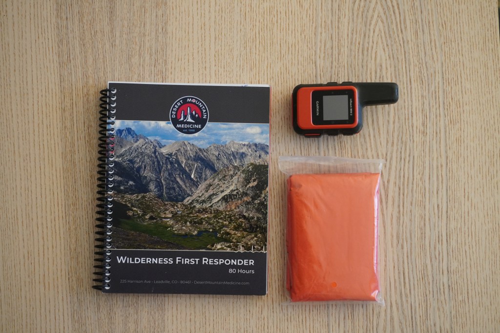 In addition to the first aid items, I also carry a Garmin InReach Mini for satellite communication and backup navigation. It also has an SOS system, in case of a dire emergency.